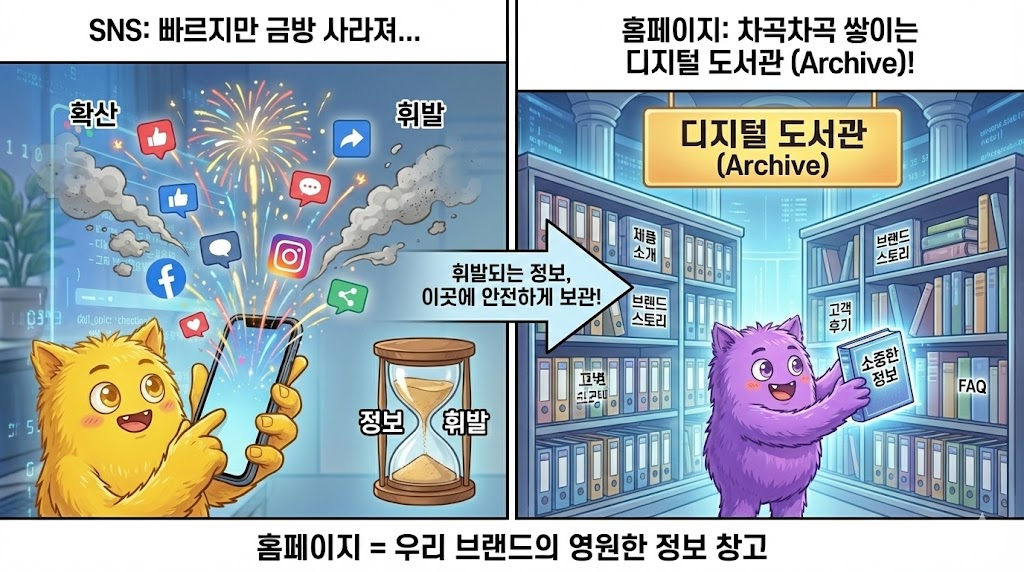 SNS가 사람들을 모으는 '광장'이라면, 홈페이지는 그 사람들을 데려와 대접하는 'VIP 상담실'입니다.