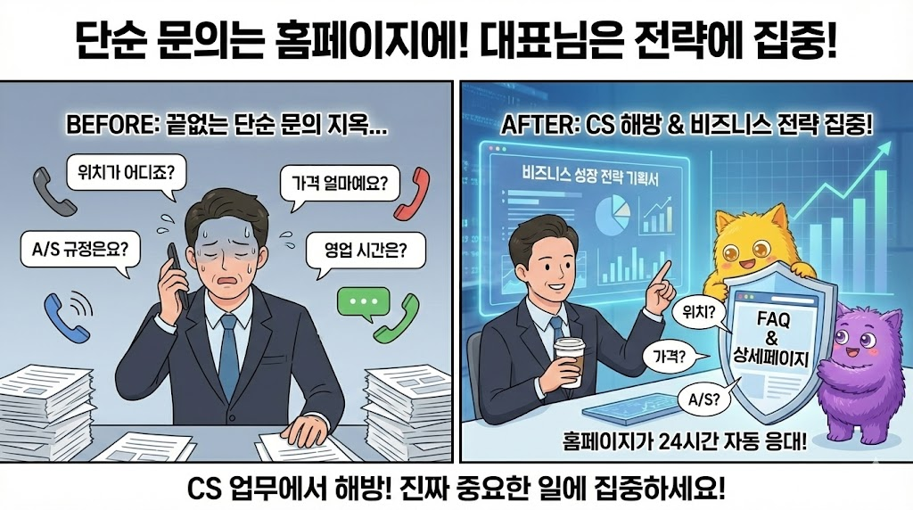또한, 홈페이지는 24시간 쉬지 않는 영업 사원입니다. 반복되는 단순 문의(위치, 가격, A/S 규정 등)를 홈페이지 내 FAQ나 상세페이지로 해결하면, 대표님은 CS 업무에서 해방되어 진짜 중요한 비즈니스 전략에 집중할 수 있게 됩니다.